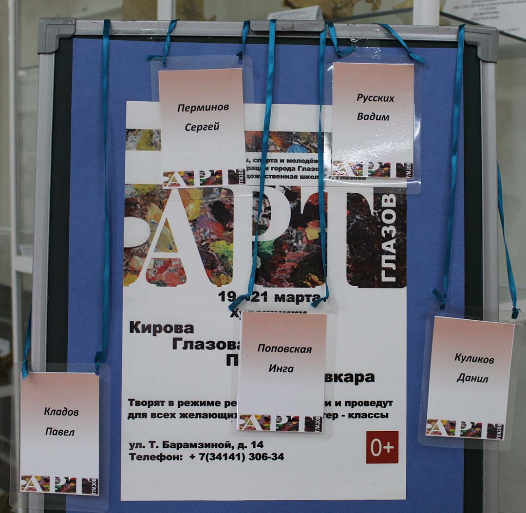 Творческий проект «ART – Глазов» с участием молодых художников из г. Кирова, Перми, Сыктывкара и Глазова, которые работали в режиме online. Выставочный зал превратился в городскую ART резиденцию, в которой каждый художник смог расположить свое пространство по своему усмотрению, чтобы создавать картины, проводить мастер-классы, встречи со зрителями, в том числе выставки своих работ. Мероприятие было ориентировано на учащихся художественных и общеобразовательных школ в целях приобретения опыта творческой деятельности и профориентации. Проект был ориентирован на большое количество посетителей - горожан, включая коллекционеров, художников, представителей музеев, журналистов, любителей искусства. В результате реализации проекта была организована выставка участников проекта «ART – Глазов».